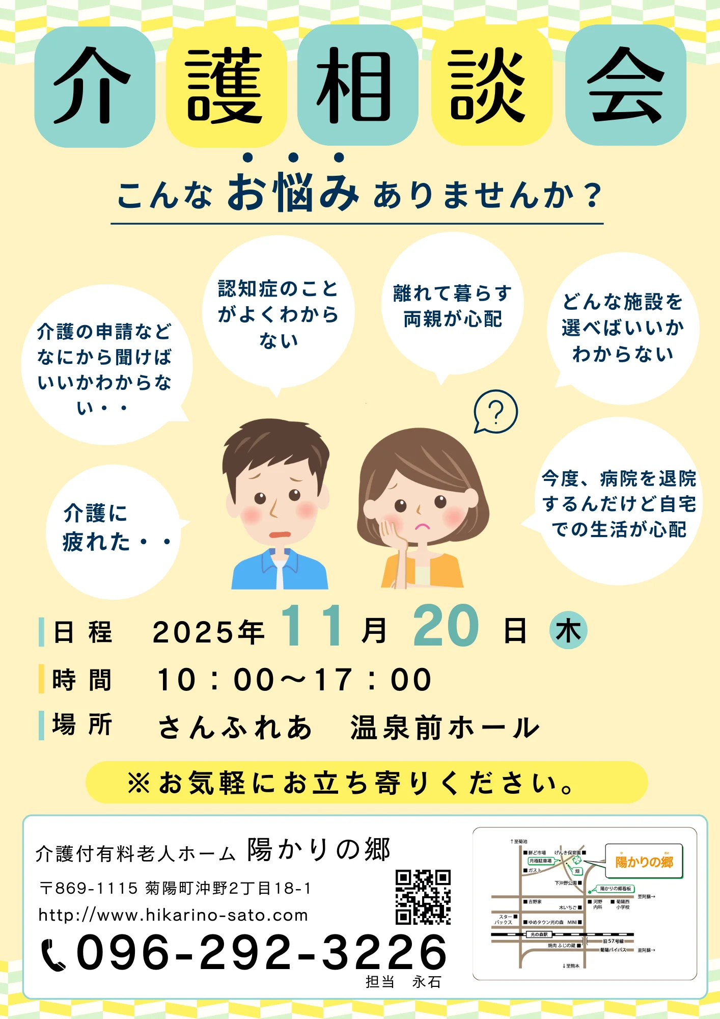 2025年11月20日(木)10:00〜17:00菊陽町総合交流ターミナル さんふれあ様にて介護相談会を実施します。お気軽にお立ち寄りください。